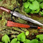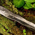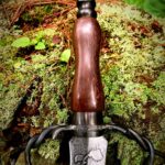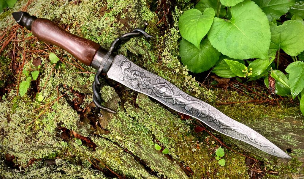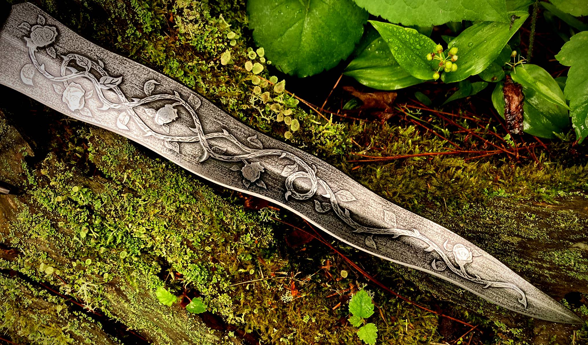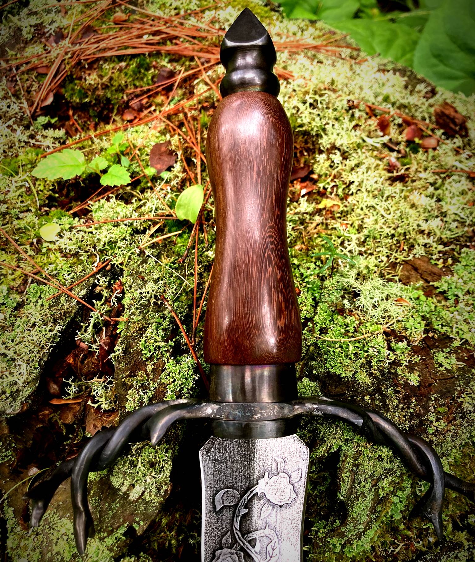 The original blade blank was forged by Windlass Steelcrafts using 1085, High Carbon Steel. I reground the blade into a flamberge profile. Both sides of the blade are hand-etched and blued, depicting a thorny rose vine. The guard is hand carved from mild steel and twisted into the shape of a vine with thorns. The handle of the blade’s through tang design is carved from Central American Katalox. Finally, the pommel is hand carved from mild steel and threaded onto the through tang, completing the blade’s “take-down design.