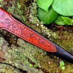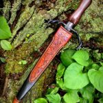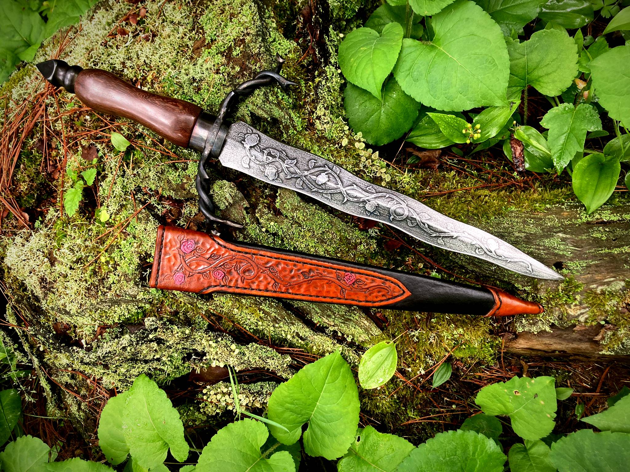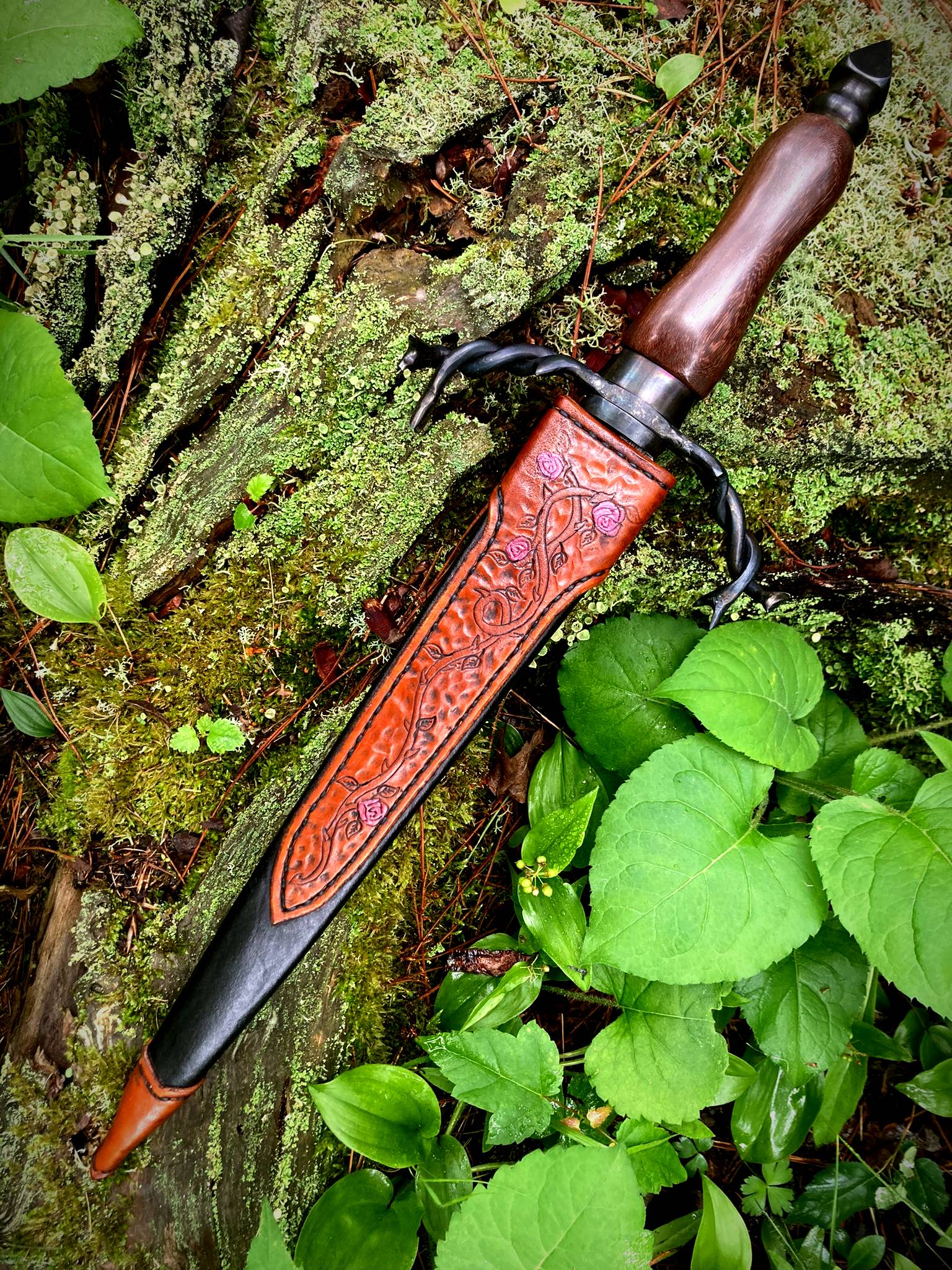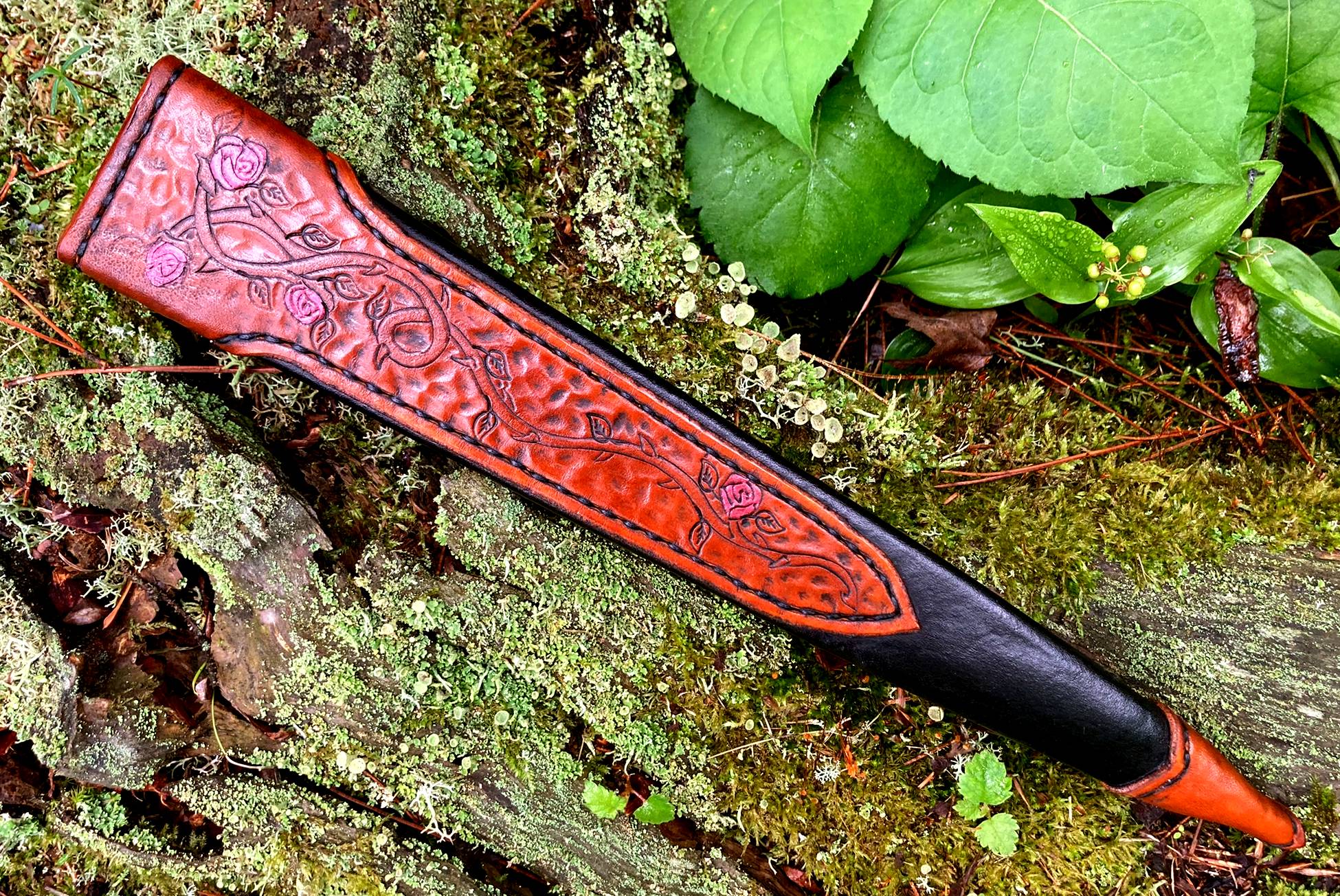 The sheath is a traditional dagger design (wet formed to the blade with hand stitching down the back spine) constructed of 4-5 oz. premium veg tan leather. The body of the sheath is stained black. The large leather throat is adorned with entwined rose vines, and both it and the chape are stained an antiqued brown.