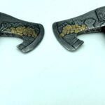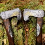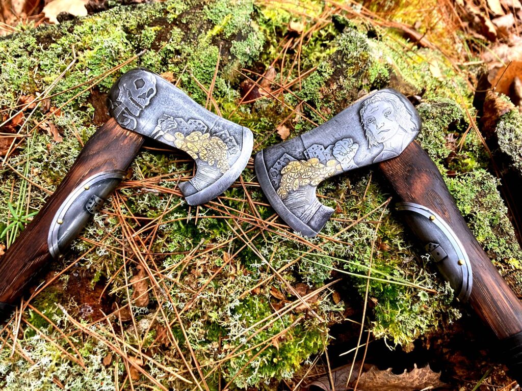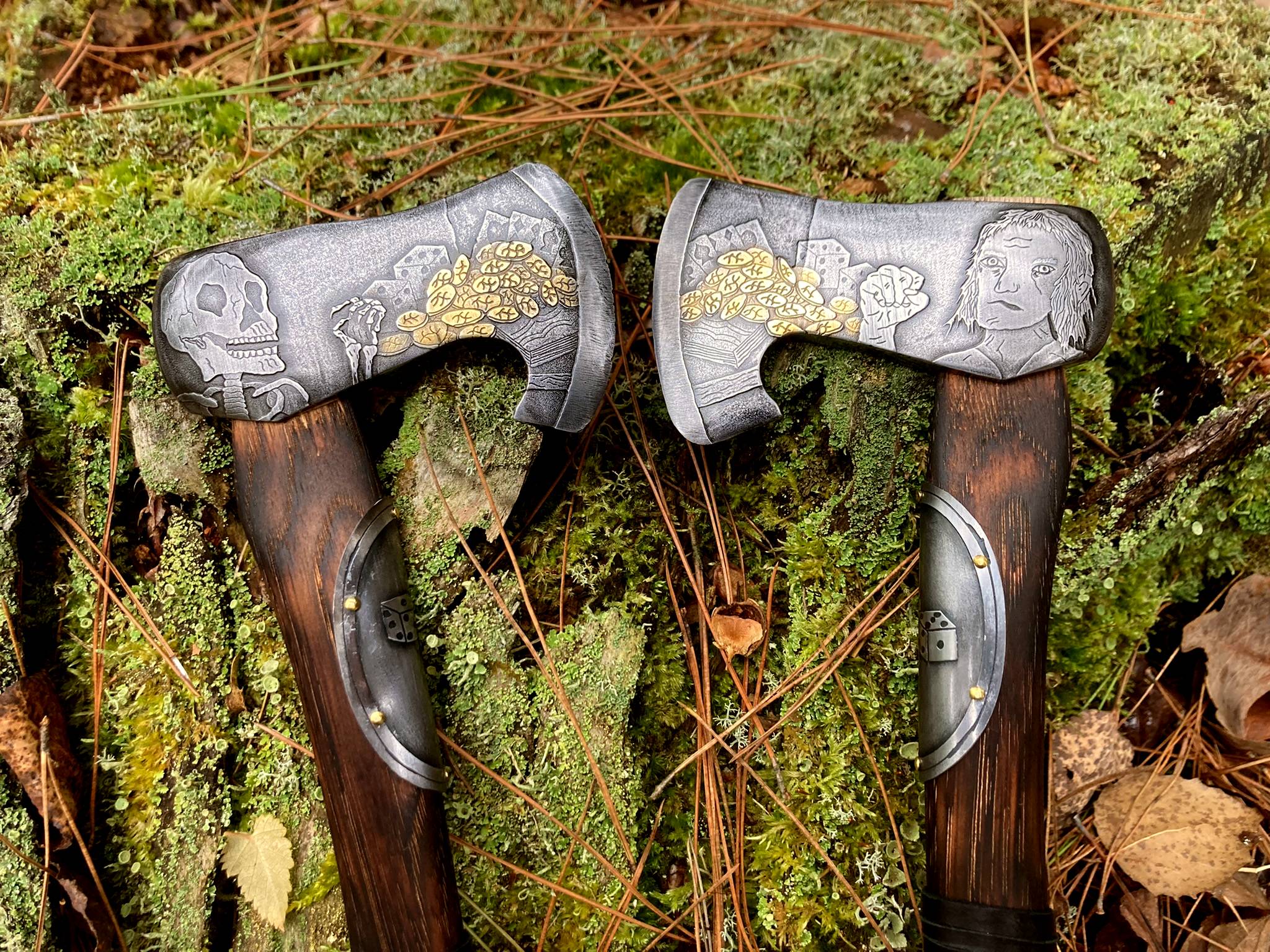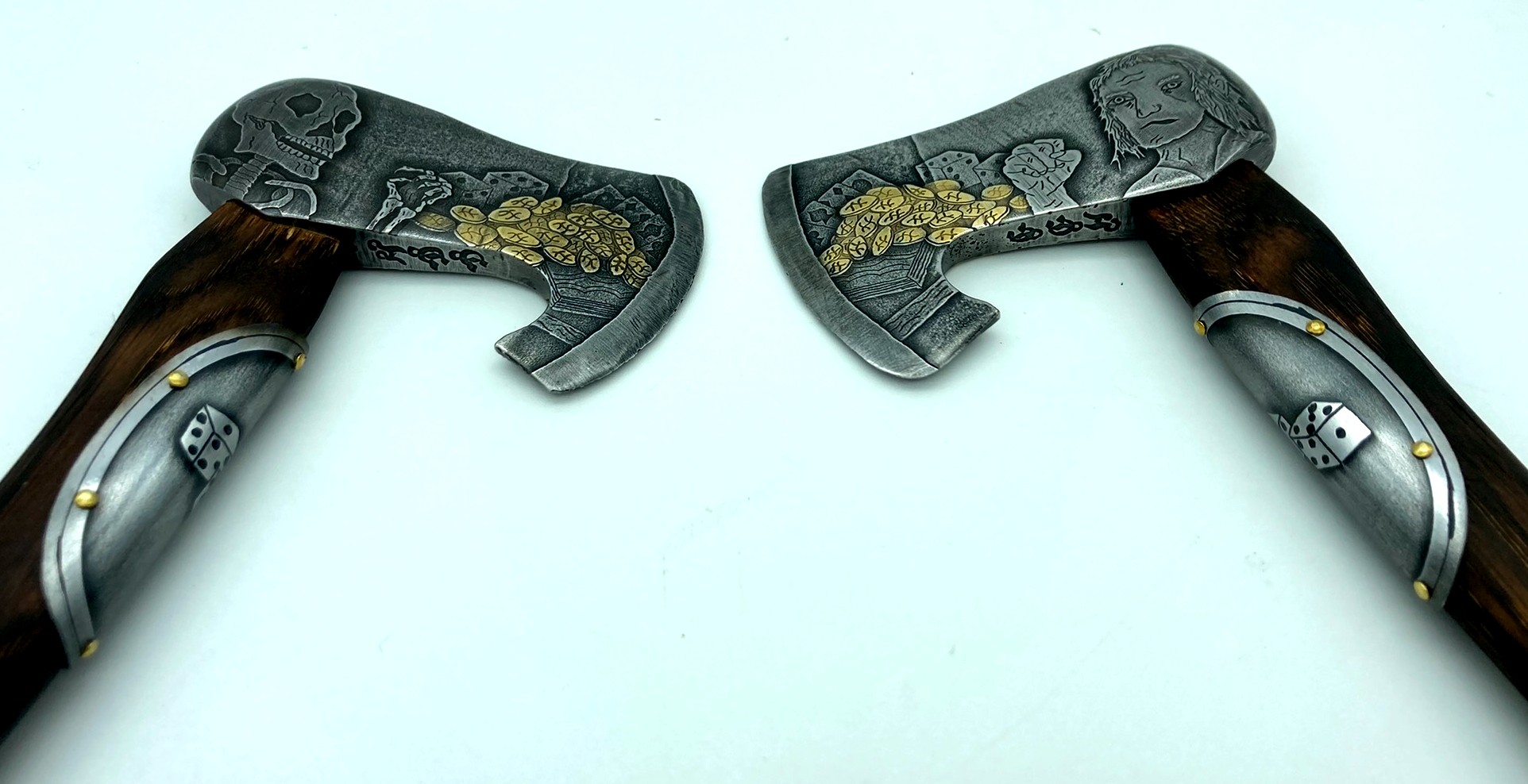 The axe heads are reclaimed single bit high carbon steel heads that I ground back to clean steel and cut into their current form. Both sides of Fortune are hand-etched with the image of a prosperous man before a table set with great fortune and luck.   Both sides of Fate are hand-etched with the image of the man after death set before the same table. The coins on each side of each blade, I electroplated with 24 carat gold. The handles are made of charred hickory, and the heads hung with walnut wedges.  The bottom 4 inches of each handle are wrapped with deer hide lacing for a comfortable grip.  A steel belly plate etched with a pair of dice, a lucky seven for Fortune and snake eyes for Fate, adorns the upper portion of each handle and are attached with brass nails.