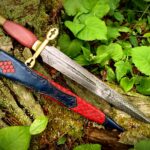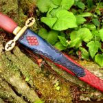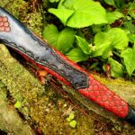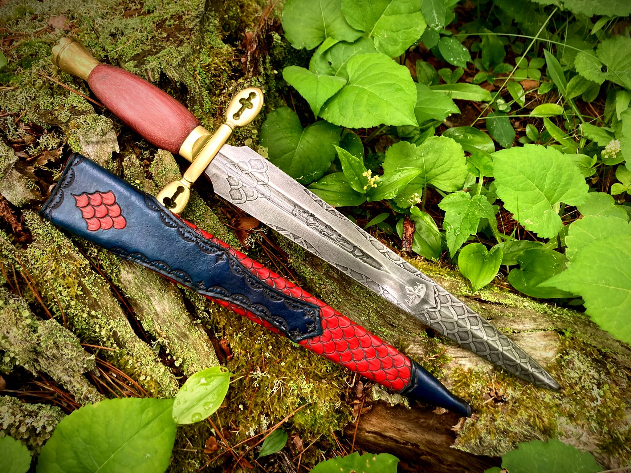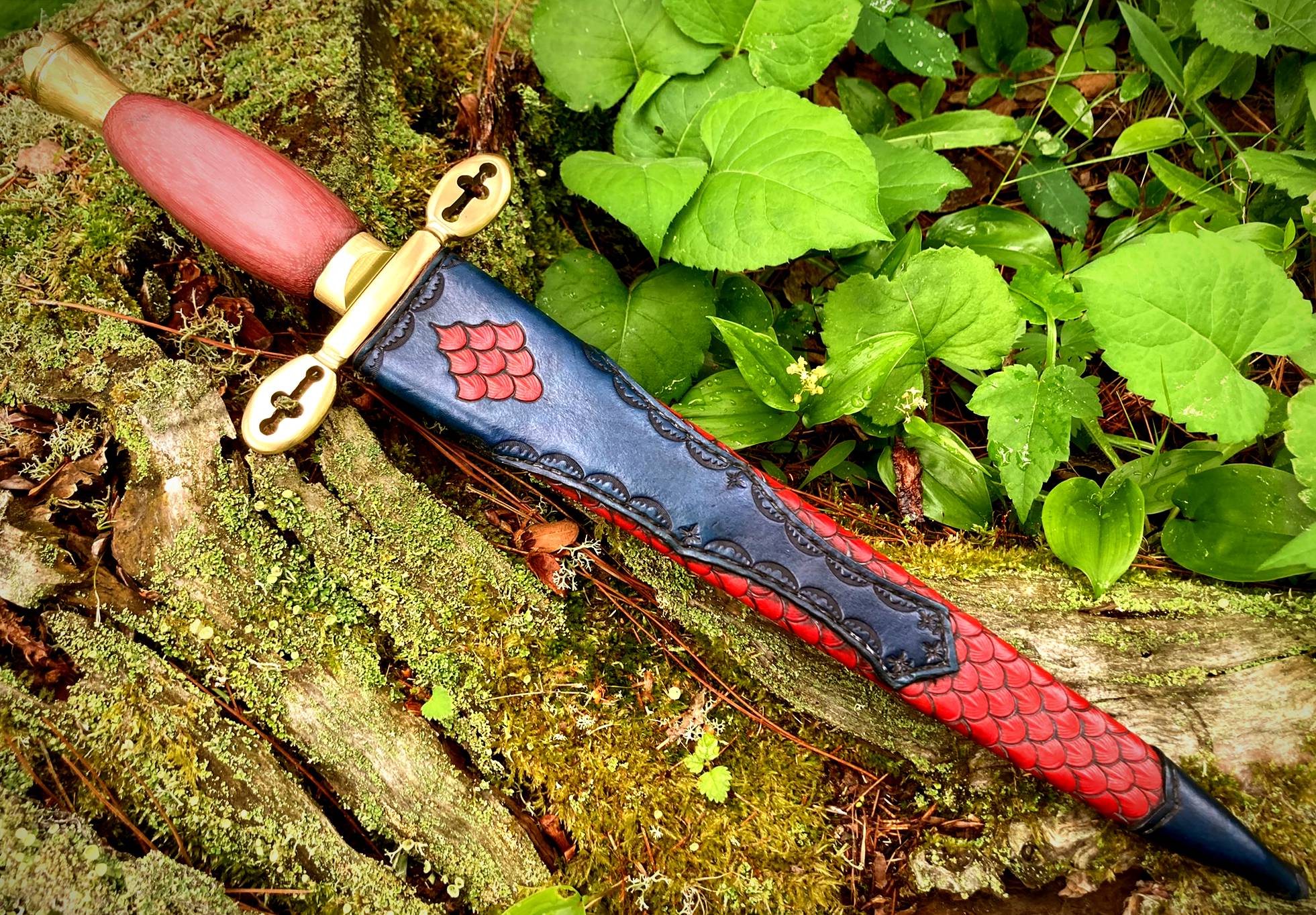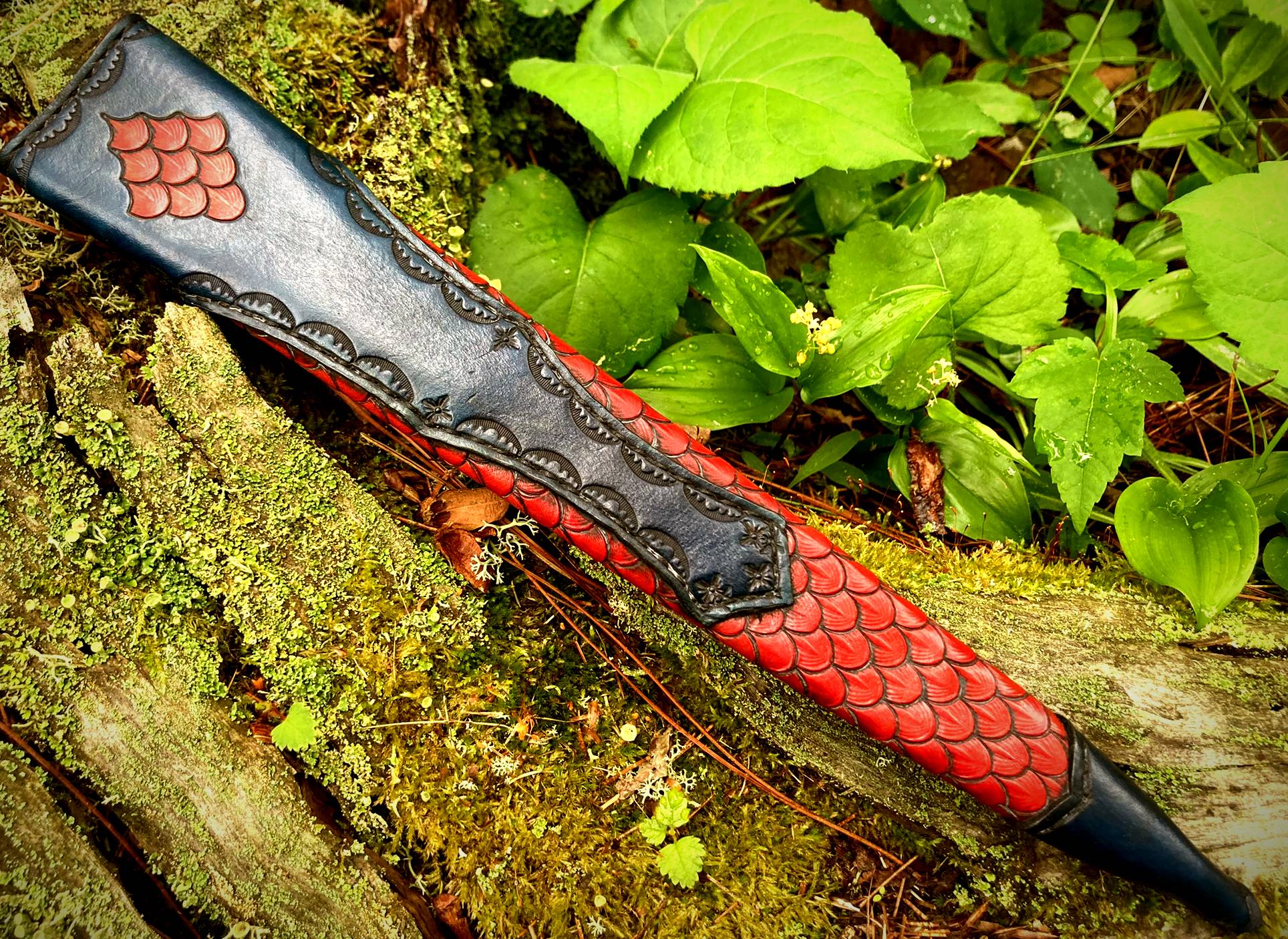 The sheath is a traditional dagger design (wet formed to the blade with hand stitching down the back spine) constructed of 4-5 oz. premium veg tan leather. The body of the sheath is stained red with black antiquing and covered with dragon scales. The throat extends two-thirds of the sheath and is stained a deep blue with black antiquing, as is the chape.