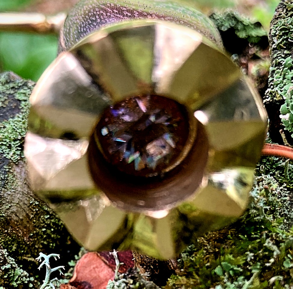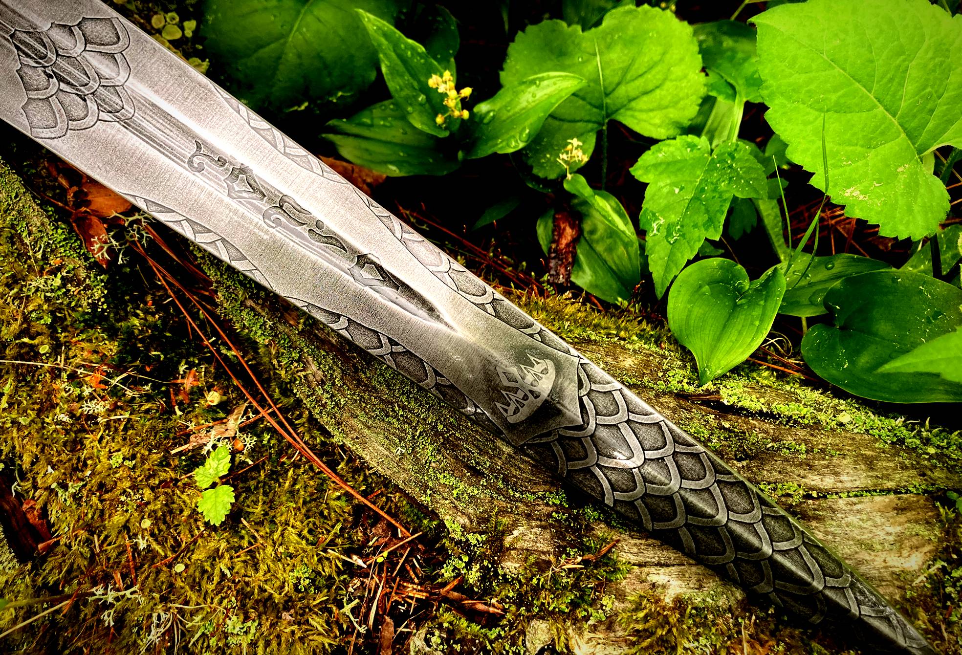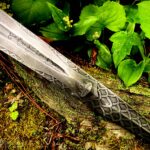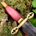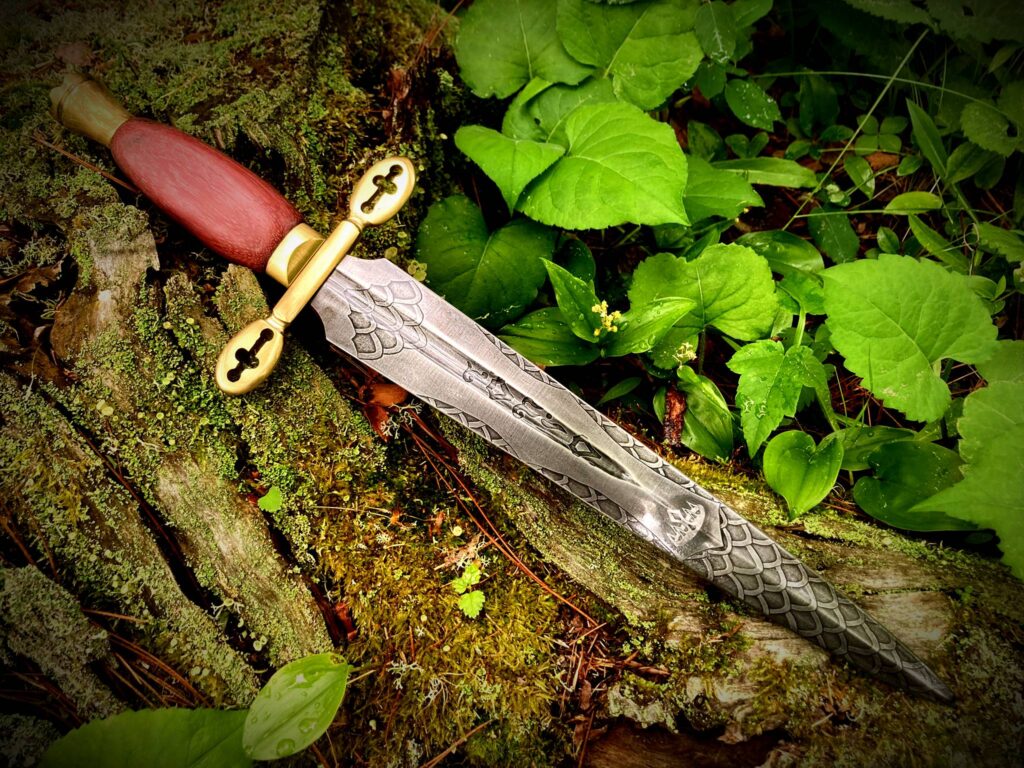 The original blade blank was forged by Windlass Steelcrafts using 1085, High Carbon Steel. I reground the blade with a thinner profile and added a fuller and narrowing ricasso where the blade meets the guard, dramatically reducing the blade’s weight. Both sides of the blade are hand-etched with dragon scales surrounding a decorative design containing a misty King’s crown and runes spelling out, Kingmaker, are etched into the fuller groove. The guard is carved from brass with decorative crosses removed from each quillon. The handle of the blade’s through tang design is carved from Costa Rican Purpleheart wood. The spacer and the threaded pommel I carved from brass. The pommel represents a king’s crown into which I set a 10-millimeter purple zirconia amethyst deep inside.