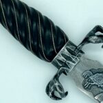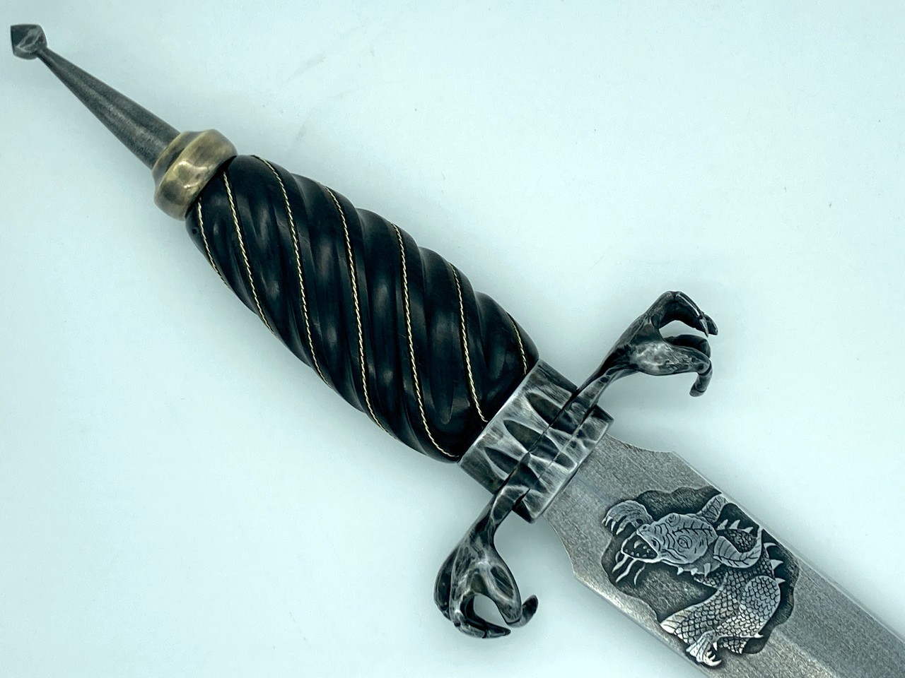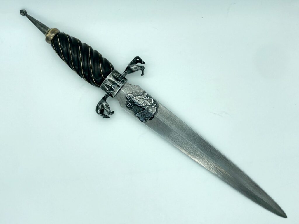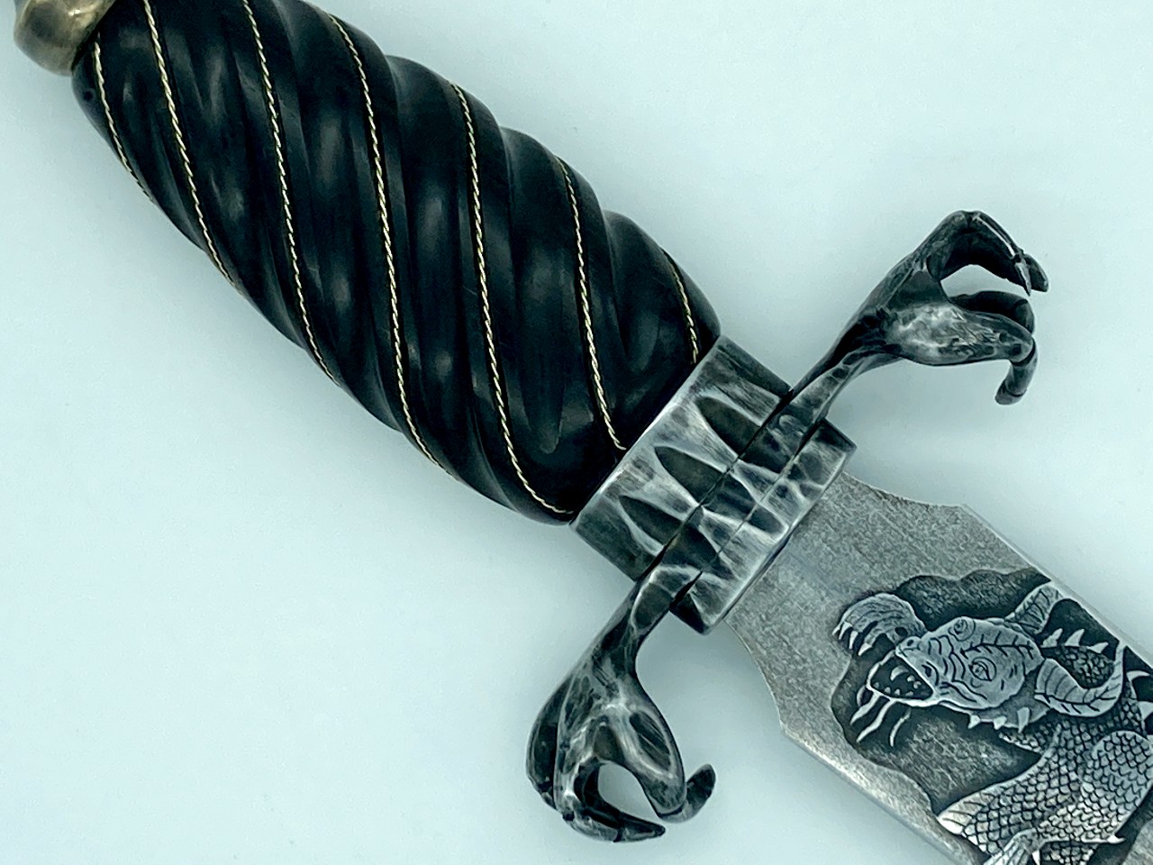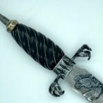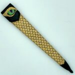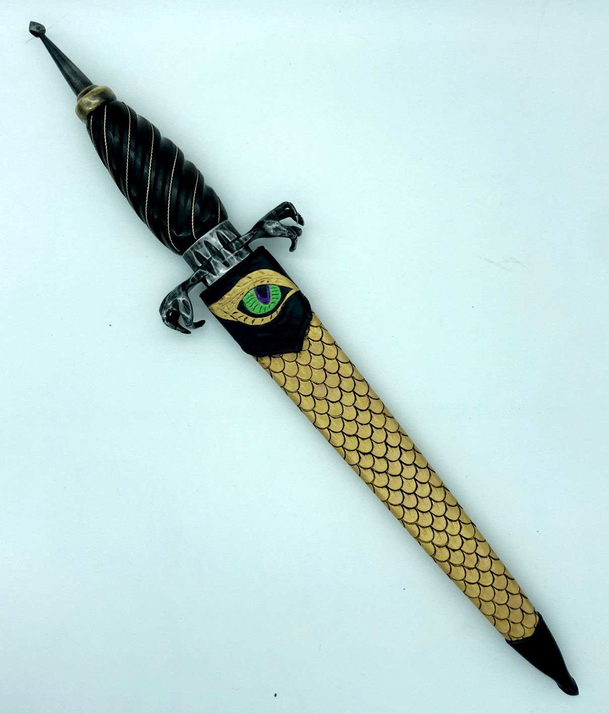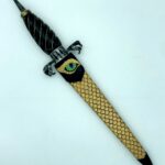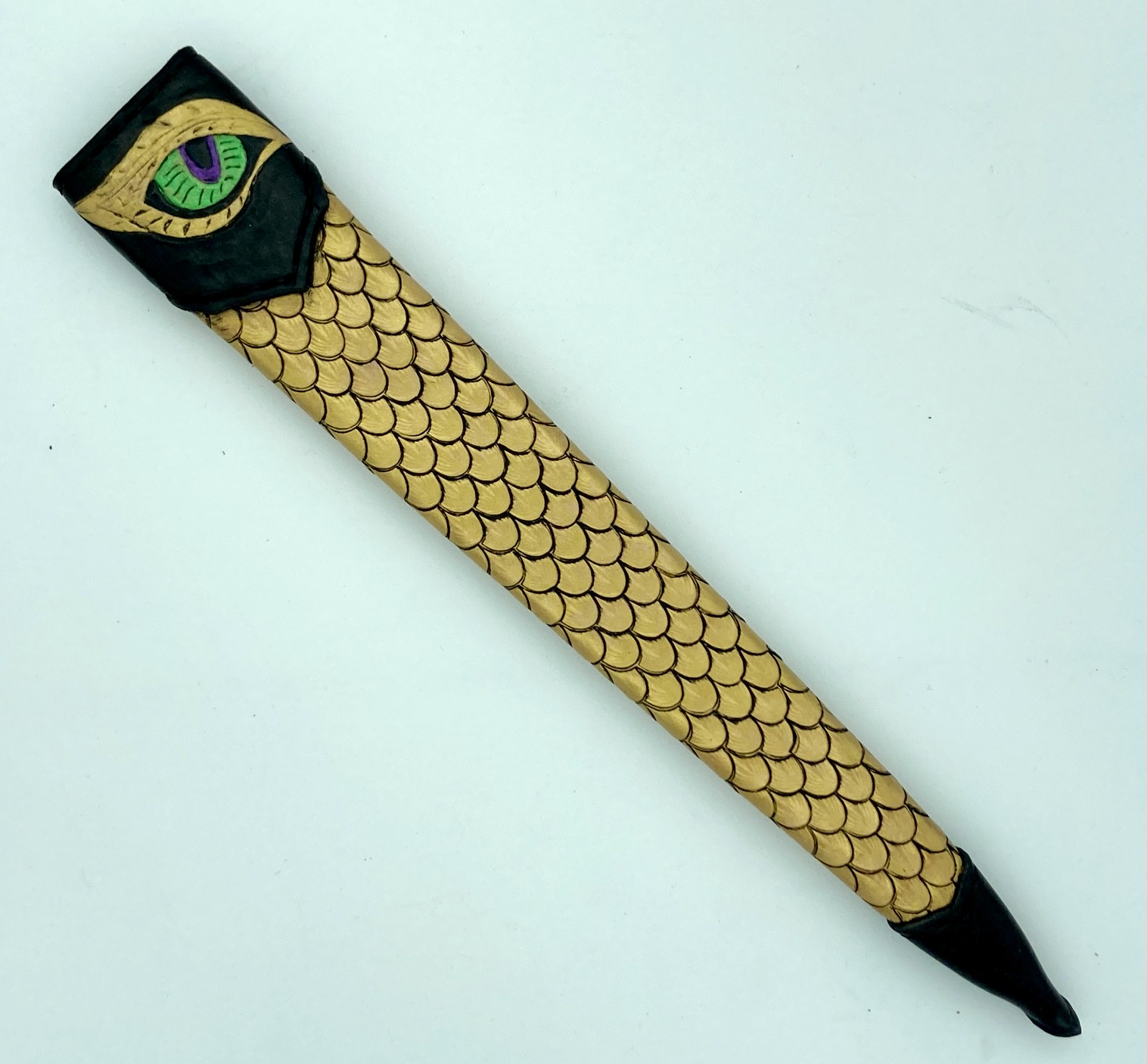 The sheath is a traditional dagger design (wet formed to the blade with hand stitching down the back spine) constructed of 4-5 oz premium veg tan leather. The body of the sheath is tooled completely in dragon scales finished with gold leather paint and black antiquing. The chape and the throat are stained black with a hand-tooled dragon eye centered in the throat.